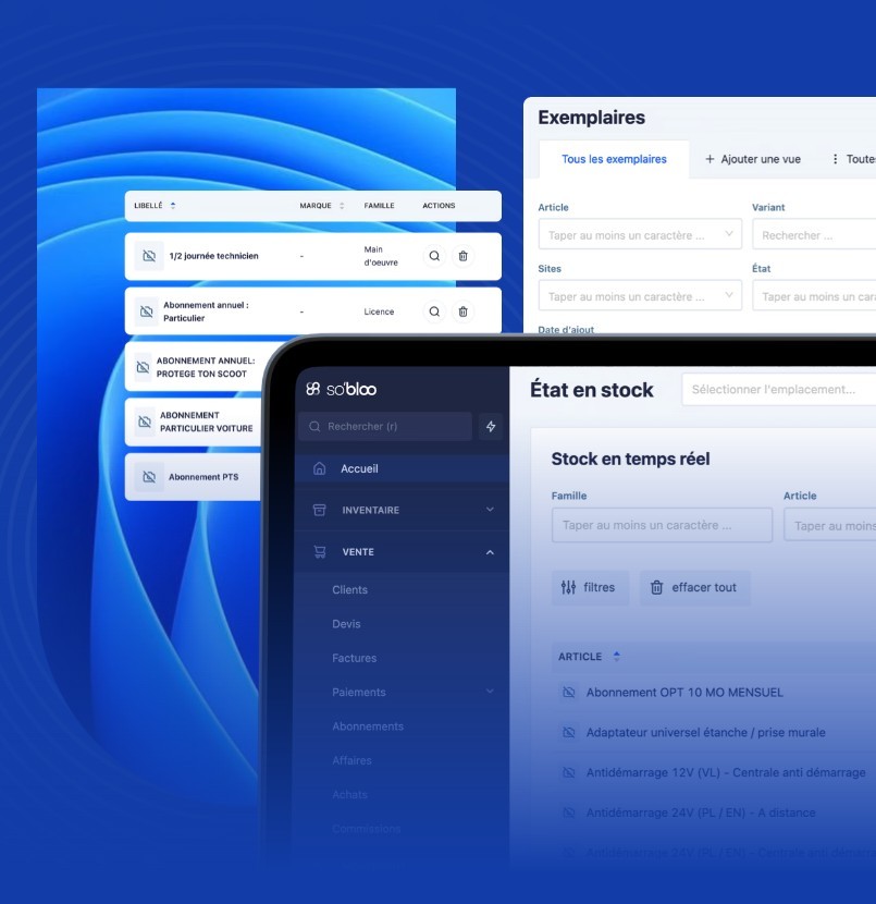 So'bloo permet la gestion complète du cycle de vente : devis, factures, acomptes, échéances, catalogue de produits et de services. Elle couvre aussi la gestion de stocks, d'abonnements, du suivi de commandes & livraisons, des déclarations douanières ainsi que de l'export des données comptables. Cette solution peut s'interfacer avec vos sites et outils e-commerce, et comprend également un module pour la restauration.