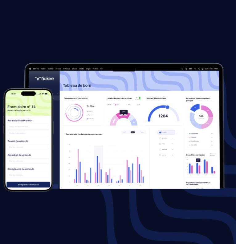 Tickee est une solution permettant de dématérialiser la collecte de données terrain via des formulaires intelligents et des outils comme les tags NFC, QR codes et IA. À partir de leurs smartphones ou tablettes, vos agents saisissent leurs comptes rendus d'intervention, les actions effectuées, les observations qu'is peuvent illustrer par des photos, etc. Les données remontent au backoffice en temps réel, et un tableau de bord permet de suivre et analyser les indicateurs afin d'optimiser le pilotage de l'activité. Tickee s'intègre avec des logiciels métiers (GMAO, SIRH, CRM), facilitant la gestion et la capture de données dans tous les secteurs.